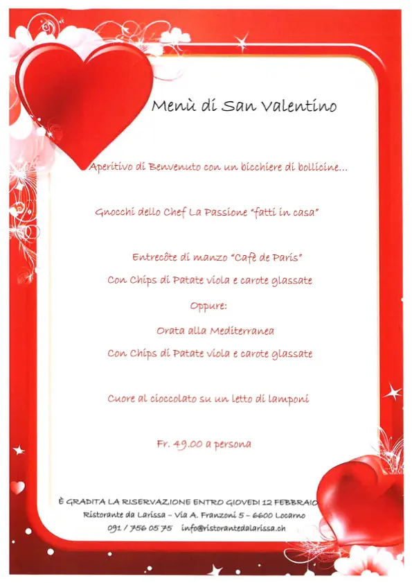 Al Ristorante da Larissa verrai accolto dalla cordialità e da un servizio di prima qualità. Possibilità di accomodarsi all’interno di una luminosa e confortevole atmosfera così come all’esterno in una soliva terrazza. Vi aspettiamo per assaporare le nostre proposte che variano fra piatti tipici della cucina mediterranea, pasta fresca fatta in casa, carne, pesce e piatti unici creati dalla fantasia dello chef. Potrete accompagnare il vostro percorso culinario con un’ ampia scelta di vini.